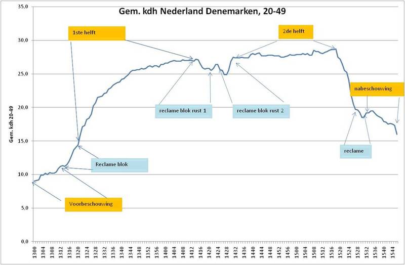 De kijkdichtheid van Nederland – Denemarken – zoals voornamelijk gemeten bij televisietoestellen in het huis – viel ronduit tegen gisteren. Met 4,48 miljoen kijkers (29,6% 13+) bleef deze marteling voor het oog zwaar achter bij de eerste WK wedstrijd van Oranje in 2006 in Duitsland. Daar waren 25% meer kijkers te noteren. Dit is natuurlijk de schuld van het ‘zomeravond’ voetbal van onze jongens. En van de maandagmiddag. Er werd veel buitenshuis en op het werk gekeken. Hier onder een fraai stukje scorebordjournalistiek met alle feiten op een rijtje qua kassadoelgroep 20-49 jaar voor de liefhebber. Klikken voor een vergroting (bron: mediabureau Mindshare).