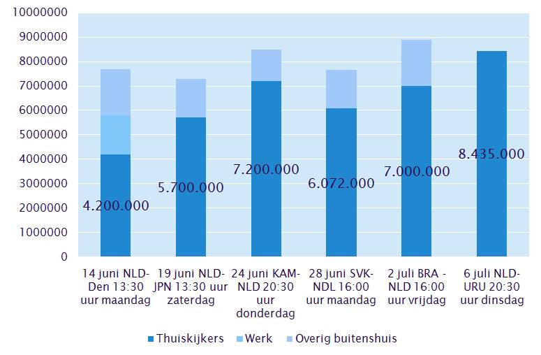 Het zat er aan te komen natuurlijk. Het hoogste thuiskijkcijfer totnutoe is gisteren in steen geschreven: 8,5 miljoen kijkers voor Nederland – Uruguay (bron: SKO via Mindshare) En we zijn nog niet klaar mensen. De commercielen zitten met de billen samengeknepen. Die hadden eigenlijk niet gerekend op wedstrijden van Oranje in juli. Maar zelfs zij leveren graag omzet in als Nederland maar wereldkampioen wordt. Is goed voor de economie toch?